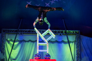 Direkt nach der Pause sehen sehen wir Robin Schmidt auf einem sehr hohen Piedestal mit seiner Flaschen-Stuhl Darbietung. Erstklassig ausgeführte Handstandfiguren erfolgen auf den verschiedenen Stuhlformationen und führen den Artisten in immer größere Höhe.