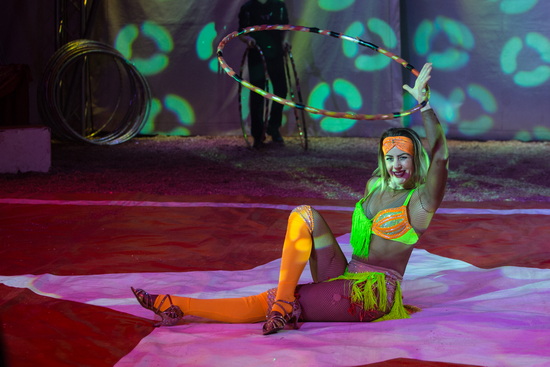 Im zweiten Teil der Show präsentiert Monique Renz eine mitreißende Hula Hoop Darbietung im Samba-Stil. Temperamentvoll erfolgen die Aktionen mit den wirbelnden Ringen und schließlich schwebt die Artistin an einer Handschlaufe in die Kuppel und lässt dabei einen Reifen um ihren Körper kreisen. Besonders effektvoll sind die Manipulationen eines Reifens mit Feuer und das abschließende jonglieren von ca. dreißig Ringen zur gleichen Zeit.