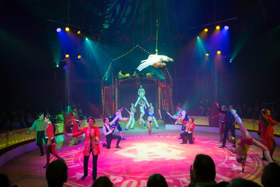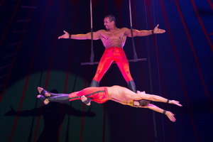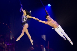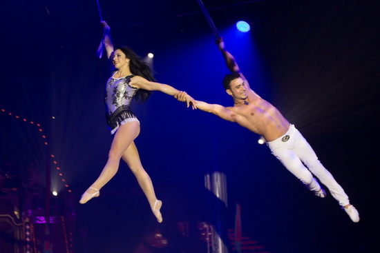 Adelina und Alex Boldojar erzählen eine mitreißende „Love Story“ an den Strapaten. Romantische Momente, die Geigerin des Orchesters begleitet die Nummer aus der Manege werden mit raumgreifenden Flügen beider Artisten kombiniert. Kraftvolle Haltetricks betonen die Athletik der Evolutionen.