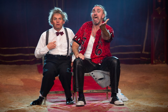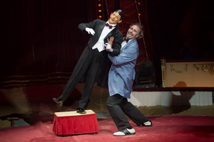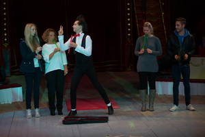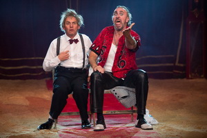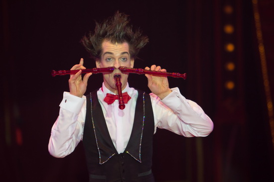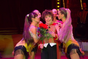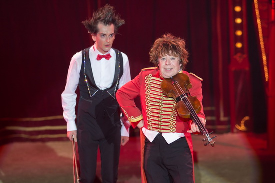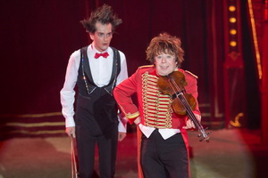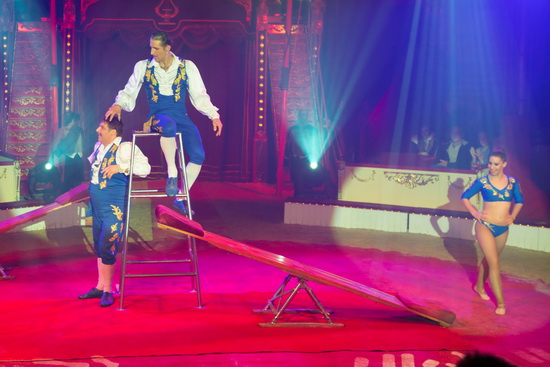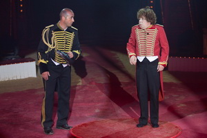 Darüber hinaus sehen wir Gabor Vosteen einige Male zusammen mit Sergej Maslennikov in hurmoresken Zwischenspielen. Maslennikov, verschiedentlich in der Roncalli-Manege zu erleben, ist der allgegenwärtige „rote Faden“ im Programm. Sowohl solo als auch in Interaktion mit Massimiliano Sblattero, dem Ballett und nicht zuletzt Gabor Vosteen bietet er feine, variantenreiche Komik mit teils verblüffenden Gags.
