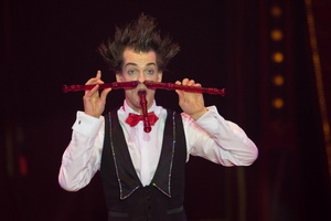 Hervorragende Musical-Clownerie und Comedy bietet der ausgebildete Blockflötist Gabor Vosteen. Der Preisträger mehrerer Kleinkunstwettbewerbe besticht mit seiner Musikalität und pointierter Komik. Bis zu fünf Flöten zur gleichen Zeit lässt er mit Mund und Nasenflügel erklingen. Im ersten Auftritt sind es allerseits bekannte klassische Musikstücke die durch sein virtuoses Spiel, groteske Mimik und teils absurde Bewegungsabläufe für Heiterkeit auf den Rängen und tosenden Applaus sorgen. Im zweiten Entree setzt er auf vier Freiwillige, die rasch in die Kunst des Flötenspiels eingewiesen werden.