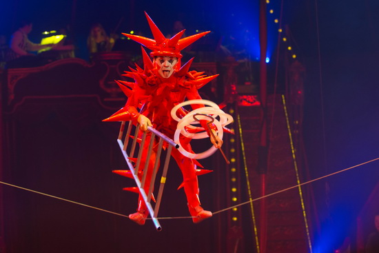 Vor der Pause präsentiert Andrej Ivakhnenko seine einzigartige Schlappseil-Darbietung. Im roten, noch immer futuristisch anmutenden Kostüm unterscheidet sich der „Igel“ rein optisch stark von allen anderen Artisten und sticht aus dem Roncalli-Ambiente deutlich hervor. Dies wird durch die eigens für die Darbietung komponierte, sehr reduzierte Musik, sie kommt aus der Konserve, zusätzlich betont. Seine spielerisch wirkenden Balancen und Jonglagen auf dem labilen Untergrund werden mit der gewohnten Präzision dargeboten.