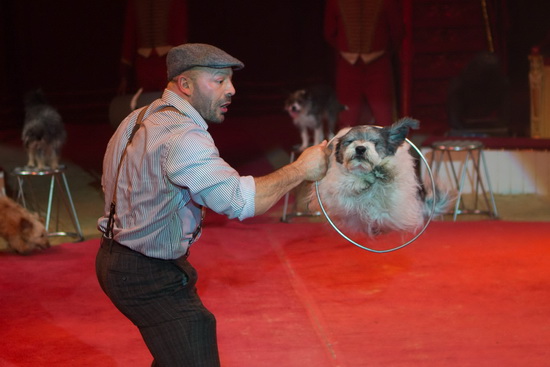 Zu Beginn des zweiten Programmteils verblüfft Wolfgang Lauenburger einmal mehr mit der Präzision mit der seine Hunde die oftmals kaum wahrnehmbaren Kommandos ausführen und voller Spielfreude in exaktem Timing ihre Tricks ausführen.