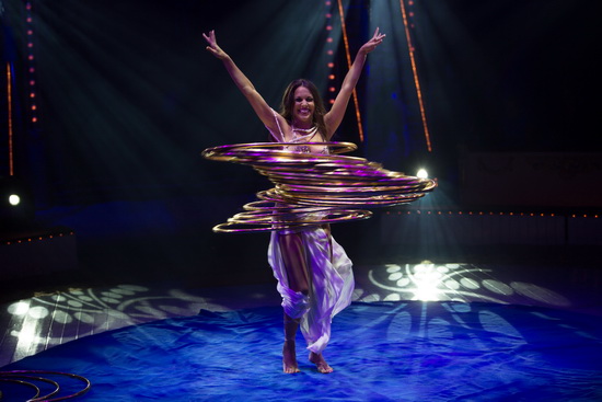 Romina Micheletty und ihre außergewöhnliche Hula Hoop Darbietung werden in hervorragender Weise präsentiert und verzaubern das Publikum. Strahlend präsentiert die attraktive Artistin mit großer Ausstrahlung ihre Kunst, die sich deutlich vom Gros des Genres unterscheidet. Tänzerisch leicht, fast schwebend agiert sie harmonisch mit ihrem Requisit und sich stetig steigernden Tempi fließen eine Reihe akrobatischer Elemente mit in die Darbietung ein.