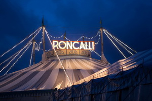 Der Circus bietet den bestens bekannten, für Roncalli typischen Anblick – nostalgischer Zaun mit hohen und aufwändig gearbeiteten Leuchten, das Vorzelt mit dem bemaltem Giebel, der dekorative Frontwagen Nr. 15 mit viel vergoldetem Zierrat und gedrechselten Säulen an der Veranda und dazu Roncallis mittlerweile historisch zu nennenden ersten Kassenwagen.