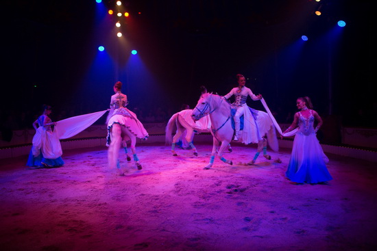 Die vorzügliche dreifache Hohe Schule der Familie Saabel ist in dieser Spielzeit als erstes zu sehen. Zunächst präsentiert Alexandra einen weißen Araberhengst im dichten Bühnennebel als furiosen Steiger. Die Darbietung wurde neu arrangiert und das Roncalli Ballett in den Ablauf mit eingebunden. Das reiterliche Können vereint sich harmonisch mit den Aktionen der Tänzerinnen und das Geschehen in der Manege geht mit den aufwändigen Kostümen sowie der perfekten Ausleuchtung und musikalischen Begleitung eine bezaubernde Symbiose ein.