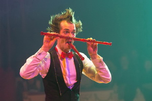 Bis zu fünf Flöten zur gleichen Zeit lässt der Künstler mit Mund und Nasenflügel erklingen. Im ersten Auftritt sind es allerseits bekannte klassische Musikstücke die durch sein virtuoses Spiel, groteske Mimik und teils absurde Bewegungsabläufe für Heiterkeit auf den Rängen und tosenden Applaus sorgen. Im zweiten Entree werden vier Freiwilligen im Handumdrehen die Flötentöne nahe gebracht.