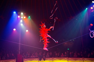 Vor der Pause präsentiert Andrej Ivakhnenko seine einzigartige Schlappseil-Darbietung. Im roten, noch immer futuristisch anmutenden „Igel-Kostüm“ unterscheidet er sich rein optisch stark von allen anderen Artisten und die seinerzeit eigens für die Darbietung komponierte, sehr reduzierte Musik, sie kommt aus der Konserve, verstärkt diesen Eindruck. Der kindlich verspielte Vortragsstil lässt die anspruchsvollen Balancen und Jonglagen auf dem schwankenden Untergrund leicht und schwebend wirken.