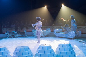 Das Chapiteau zeigt sich im gewohnten Roncalli-Look – der originale Artisteneingang mit den seitlichen steilen Treppen hinauf zum Musikerpodium, die edlen reich verzierten Logen und ein den Raum komplett füllendes rotes Bankgradin. Lediglich Balkonlogen sind bei dieser Einheit nicht vorhanden.