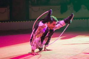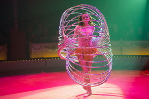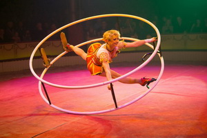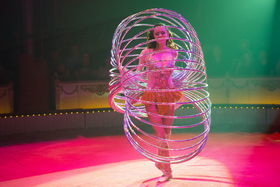 Wenig später erleben wir die Hula Hoop Darbietung von Alla Klyshta. Charmant lässt die versierte Artistin die Ringe in immer wieder neuen Varianten um ihren Körper kreisen und schließlich manipuliert sie sieben Reifen zur gleichen Zeit.