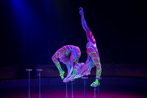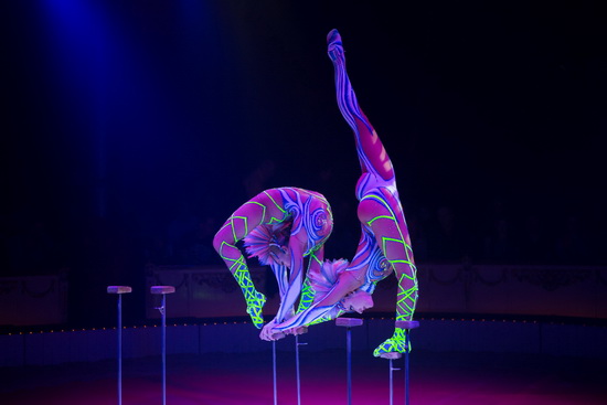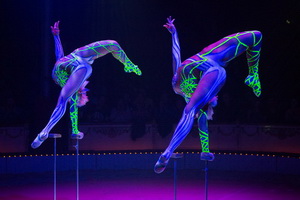 Alexandra und Kelly Saabel bieten mit ihrer exzellenten Handstandequilibristik den finalen Höhepunkt der Show. Synchron arbeiten die beiden Schwestern ihre anspruchsvollen Tricks, die perfekt und elegant ausgeführt werden. Im Schwarzlicht bewegen sich die Künstlerinnen voller Anmut in den phantastischen, von Alexandra designeten Kostümen und beinahe scheint es, als schwebten die beiden jungen Frauen im Raum.