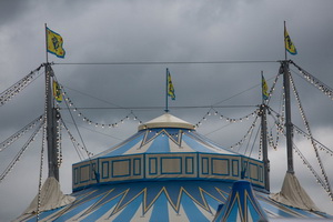 Über dem cremefarbenen Zelt mit den blauen Absetzungen flattern gelb-blaue Fahnen an den Mastspitzen. Dicht drängen sich eine Reihe hölzerner Oberlichtwagen – der üppige dekorierte Kassenwagen, Büro,Garderoben und Schneiderei, Elektrozentrale – um die Zeltanlagen. Zwei antike Packwagen, an ihnen zeigt sich, dass hölzerne Wagen eine nie endende Aufgabe für Restaurateure sind, ergänzen das Ensemble.
