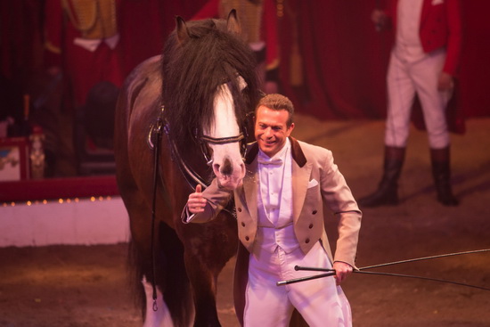 Anschließend folgt ein, alleine ob des enormen Größenunterschieds der beiden Manegenpartner beeindruckenden, Groß-und-Klein eines mächtigen Shire-Horse und eines sehr kleinen Ponys. Ein perfekter Steiger des riesigen Kaltblüters beschließt die Freiheitsdressuren eindrucksvoll.