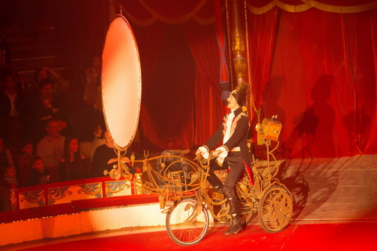 Der erste von etlichen verschiedenen Manegenteppichen die im Verlauf der Show zum Einsatz kommen und immer wieder mit einigem Aufwand gewechselt werden, ist als Zifferblatt einer überdimensionalen Uhr gestaltet. Auf einem kleinen Podest in seiner Mitte bietet Sergi Buka in einem an eine napoleonische Uniform erinnernden Kostüm eine Lasershow. Er formt den gleißenden grünen Lichtstrahl zu verschiedenen Mustern.