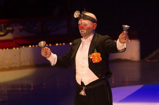 Abendregisseur Patrick Philadelph begrüßt im vollbesetzten weiten Rund die Besucher und seine Anweisungen bezüglich Rauch- und Videoverbot, bzw. der Lage der Notausgänge werden von den Clowns anschaulich illustriert.