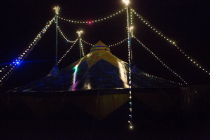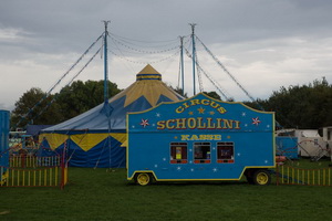 Die neuen Bundesländer hat sich die Familie Scholl zum Reisegebiet erkoren und machte für ein Wochenende im thüringischen Neustadt a. d. Orla Station. Auf dem Festplatz am Stadion war der Circus wunderschön aufgebaut. Hoch ragen die vier Masten des gelb-blauen Chapiteau in den Himmel. Mit hellem funkeln transportieren die Lichter der Palmen auf ihren Spitzen und die Lichterketten in der Dunkelheit den romantischen Charme des Circus. Im Zentrum der breiten Front hat der dekorative Kassenwagen seinen Platz. Sämtliche Wagen und Auflieger sind sauber in blau mit gelben Absetzungen lackiert und die Frontwagen tragen den Namenszug des Unternehmens auf ihren Flanken. Ein gelb-roter Zaun mit Lichterbögen komplettiert die Fassade. Die Zugmaschinen stehen seitlich in einer Linie ausgerichtet und die Transporte und Wohnwagen der Familie sind zu einem Karree entlang der Platzseiten aufgefahren. Die Rückseite des Geländes nimmt der geräumige Stall ein. Pferde, Ponys, Lama, Ziegen und Hunde haben hier in großzügigen Boxen und geräumigen Freigehegen ihr Zuhause und auf der Wiese abgesteckte Koppeln bieten den Pferden Freiraum.