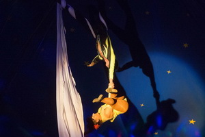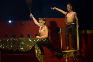 Gleich darauf erleben wir das Direktionspaar an den Tuchstrapaten. Beide Partner bieten eine Reihe eleganter, kraftvoll ausgeführter Solotricks. Gemeinsame Aktionen und schwungvolle weite Flüge durch die Kuppel runden die erstklassig dargebotenen Tricks effektvoll ab.