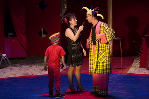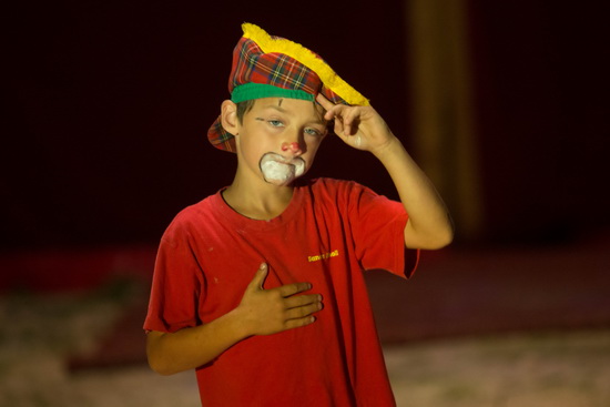 Clown „Lummi“, der achtjährige Sandro ist in dieser Rolle zu erleben, versucht sich in seinem ersten Auftritt als Schlangenbeschwörer.