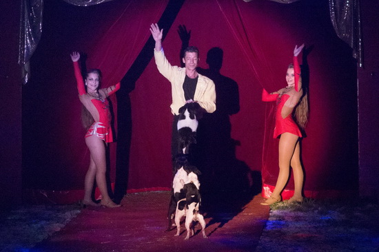 Den Reigen der Dressurnummern komplettiert Martin Scholl mit einer erstklassigen Hunderevue. Außergewöhnlichen Drive erhält die Darbietung durch die Einbeziehung „lebender Requisiten“. Sally und Cherry Scholl bilden im u. a. Handstand und Spagat verharrend die Hindernisse, die von den Vierbeinern zu überspringen oder umrunden sind.