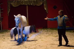 Im zweiten Programmteil präsentiert Marcel Frank ein Groß-und-Klein. Ruhig agierend lässt der Vorführer zunächst die typischen, vielfach zu sehenden Abläufe ausführen. Dann sehen wir einen ungewöhnlichen Trick. Das Pony steht quer zur Laufrichtungdirekt vor seinem großen Kollegen an der Piste und dieser springt aus dem Stand über das Kleinpferd.