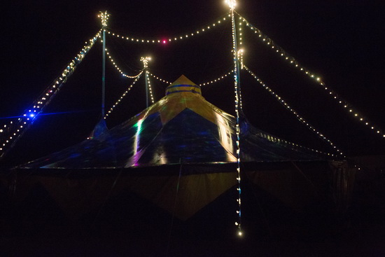 Das Innere des zwanzig Meter Durchmesser zählenden Zeltes wird zum größten Teil von einem vierreihigen Bankgradin eingenommen. Zwei Reihen gelber Logen-Klappstühle ziehen sich hinter den hübsch gestalteten Brüstungen dicht um die Leuchtpiste. Der romantische rote Artisteneingang nimmt den hinteren Bereich des Zeltes ein und die Circusrestauration findet gleichfalls hier ihren Platz.