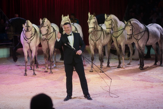 Manuel Frank präsentiert den Zwölfer-Zug Freiheitspferde des Hauses in meisterhafter Manier. Nach den ersten Touren, die in großer Präzision schwungvoll ablaufen, verzichtet der erfahrene Dresseur auf jedwede Hilfsmittel und dirigiert die Hengste nur mittels Stimme und knappen Zeichen seiner kräftigen Hände zu ihren mannigfaltigen Lauffiguren. Souverän und spielerisch leicht wirkend lässt Manuel Frank die Darbietung ablaufen und mit einigen formidablen Steigern endet dieser hervorragende Auftritt in idealer Weise. Chapeau.