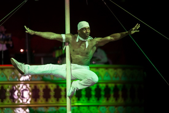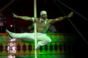 Francisco bietet eine eindrucksvolle Abfolge kräftezehrender Tricks am Chinesischen Mast. Karibische Lebensfreude und ebensolche musikalische Begleitung verleihen der Darbietung eine beschwingte heitere Note und lassen die Anstrengung in den Hintergrund treten.