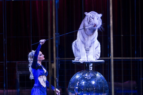 Der zweite Programmteil beginnt mit Carmen Zanders erstklassiger Tigerdressur. Perfekt arbeiten die fünf prächtigen Raubkatzen im Zusammenspiel mit ihrer sympathischen Trainerin ihr umfangreiches und attraktives Repertoire. Die zahlreichen Sprünge, Hochsitzer, Steiger, Futterabnahme direkt aus der Hand und vom kurzen Mundstab und zahlreiche Kontakttricks werden von der Tigerlady und ihren Lieblingen mit bekannter Präzision gearbeitet. Nach dem stimmigen Schlussbild der drei in der Manegenmitte hochsitzenden Tiger erfolgt nun neu ein Da Capo. Nachdem die fünf Tiger wieder am Platz sitzen kommt Carmen Zanders weiße Tigerin „Saphira“ hinzu. Das noch nicht ausgewachsene Jungtier steht am Platz gegen den Käfig hoch und wird effektvoll auf einer drehenden Spiegelkugel präsentiert.