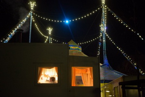 Das Vorzelt ist geschmackvoll weihnachtlich dekoriert und bietet dem Verkaufswagen der Circusrestauration Raum.