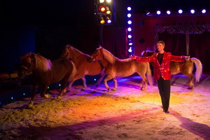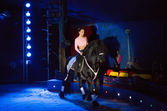 Noch einmal wechselt die Szene und Kimberley Scholl lässt drei Araber ihre mannigfaltigen Lauffiguren ausführen. Souverän und elegant agiert die junge Dresseurin und krönt den famosen Auftritt mit einigen gelungenen Steigern.