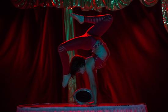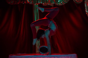 Miss Cherry begeistert mit einer erstklassigen Kautschuk-Arbeit. Flüssig leicht, scheinbar ohne die geringste Anstrengung, nimmt die junge Frau die unterschiedlichen Positionen ein. Die zahlreichen Tricks werden hervorragend präsentiert. Eine Reihe anspruchsvoller Tricks sind in den Ablauf eingebunden und werden mit großer Selbstverständlichkeit geboten. Abschließend nimmt die junge Artistin ihren Hut, der etwa fünfundzwanzig Zenitmeter unter der Position ihrer Füße liegt, mit dem Mund auf.