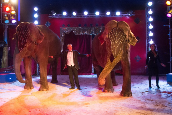 Gleich darauf bringt Kalle Scholl seine beiden mächtigen indischen Elefanten in die Manege. Die beiden schwergewichtigen Tiere wirken in dem intimen Rahmen des kleinen Chapiteau umso imposanter und beherrschen ein umfassendes, tiergerechtes Repertoire. Souverän und flüssig werden die Abläufe dargeboten und ein direkt aus dem Lauf heraus gezeigter Kopfstand bildet den akrobatischen Höhepunkt des Auftritts.