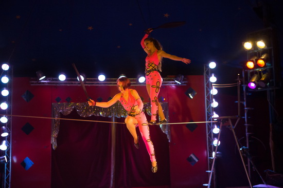 Nach der Pause brillieren die Schwestern Cherry und Sally auf dem gespannten Silberdraht. Bocksprung und laufen in Reifen, viele Schrittkombinationen und verschiedenste Balancen bis hin zum Spagat erfolgen mit Temperament in sicherer Ausführung. Einzigartig ist ihr außergewöhnlicher Schlusstrick. Nacheinander überqueren die Schwestern das Seil, indem sie sich bei jedem Schritt in einen Spagat gleiten lassen und blitzschnell, ohne Hilfsmittel nur mit der Kraft ihrer Beine wieder in stehende Position zurückkehren.