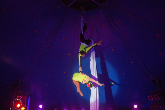Gleich darauf erleben wir Martin Scholl und PeggyFrank an den Tuchstrapaten. Weite Flüge durch die Kuppel kennzeichnen den Auftritt. Zudem bieten beide Partner eine Reihe eleganter, kraftvoll ausgeführter Solotricks.