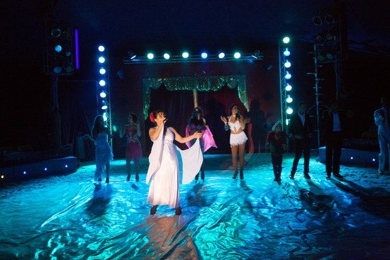 Im Chapiteau stehen ein vierreihiges Bankgradin und dekorative Logen für die Besucher zur Verfügung. Der romantische rote Artisteneingang wird von einer Reihe Scheinwerfer eingerahmt und nimmt den hinteren Bereich des Zeltes ein.