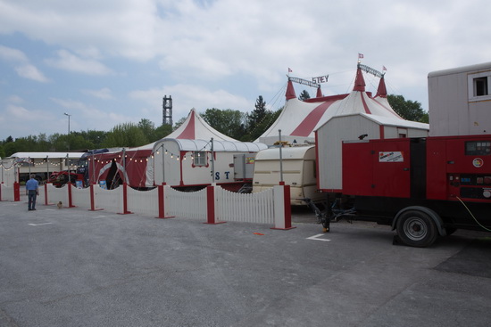 In Horgen am Zürichsee gastierte der Circus auf der Allmend, dem traditionellen Versammlungs- und Festplatz. Der schmucke Circus glänzt im hellen Schein der Frühlingssonne. Ein nostalgisch anmutender Zierzaun, mit zahlreichen Lichterketten geschmückt, bildet in Verbindung mit dem Tonnendach-Kassenwagen die dekorative Front. Vier mächtige Hürlimann Traktoren sind gegenüber der Kasse aufgefahren. Die modernen Zeltanlagen, Viermasten-Chapiteau mit hoher langer Kuppel und passendes Vorzelt, sind in weiß mit rotem Dekor gehalten. Der umfangreiche, gepflegte Fuhrpark, zu dem einige liebevoll restaurierte hölzerne Tonnendachwagen gehören, erstrahlt in weißem Lack mit roten Absetzungen und viele Wagen tragen in blauen Lettern den Circusnamen.