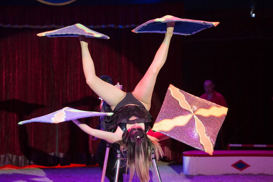 Miss Otilia ist zunächst mit ihrer Antipoden-Darbietung zu erleben. Routiniert lässt die charmante junge Frau die Requisiten über Hände und Füße wandern. Voluminöse Walzer, kleine Teppiche und Hula Hoop Ringe werden virtuos gehandhabt.