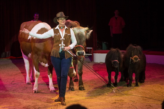 Die Direktion des Hauses präsentiert im ersten Programmteil die beiden hauseigenen Dressur-Darbietungen. Mia Arnosi-Stey lässt zwei Kühe im Zusammenspiel mit zwei Shetland-Ponys ihre Lauffiguren vortragen. In aller Gelassenheit, das Logenpublikum genau betrachtend, ziehen die Rinder ihre Bahnen und die Ponys trippeln munter durch den Manegensand. Als Da Capo zeigt ein recht großer Ziegenbock sein Sprungvermögen.