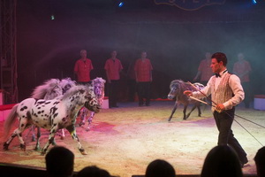 Martin Stey präsentiert einen Sechser-Zug Tigerschecken-Ponys. Die Kleinpferde mit der dekorativen Fellfarbe beherrschen ein umfangreiches Repertoire, das vom versierten Vorführer gekonnt abgerufen wird. Ein Da Capo Steiger schließt den Auftritt in gelungener Weise ab.