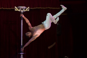 In einem mitreißenden Auftritt begeistert er mit äußerst kraftvoll ausgeführten Evolutionen am Pole. Zahlreiche Absteher erfolgen spielerisch leicht wirkend in erstklassiger Weise. Ein kurzer leiterähnlicher Aufsatz mit Handstäben auf der Spitze des etwa zwei Meter hohen Mastes dient als Plattform für exzellente Einarmer und Handstandwaagen. Mit weiteren drei weiteren Paaren, längeren aufsteckbarer Handstäben arbeitet sich der Artist weiter empor und führt seine Handstände in großer Höhe gekonnt aus.