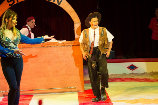 Schließlich sehen wir ihn gemeinsam mit Clown „Bimbo“ (Martin Stey) und Miss Otilia, die den seriösen Part übernimmt, im Saloon-Entrée. Turbulent geht es zu beim „Casting“ für einen Cowboy und Indianerfilm.