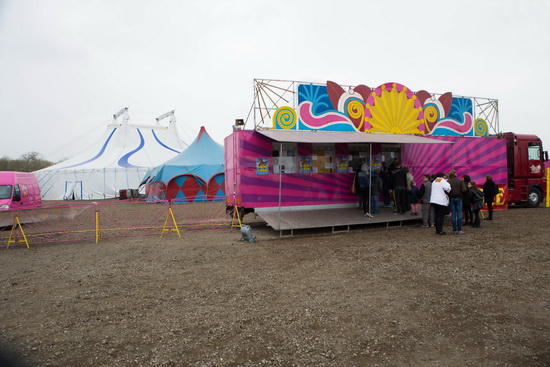 Ein Sattelzug mit pink-violettem Streifenmuster und bunten Leuchtelementen obenauf ist das zentrale Element der Front und beherbergt die Kasse. Die Schiebeplanen eines weiteren Sattelzuges zeigen auf einem blauen Wellendesign in gelber Farbe den Namen des Circus. Drei pink gestrichenen Zaunelemente bilden den Eingangsbereich zum Gelände.