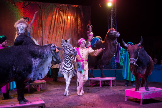 Als orientalischer Potentat kommt Carlos Savadra in die Manege, nachdem das Ballett den Auftritt eingeleitet hat. In einer umfassenden Dressurfolge stellt der erfahrene Dresseur seinen Exotenzug vor. Fünf Ponys und drei Esel laufen zunächst ihre Figuren. Ihnen folgen zwei Kamele, Zebu, Watussi und drei Lamas mit ihrem reichhaltigen Repertoire. Abschließend umrundet ein Zebra die mit Figurantinnen berittenen, auf Tonneaus stehenden, Kamele.