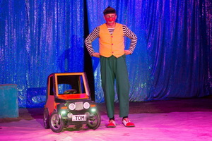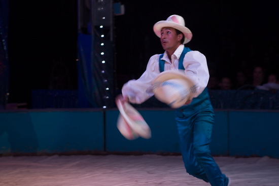 Mit erstklassiger Clownerie unterhält der polnische Komiker Tomasz Kolosko das sehr zahlreich erschienene Publikum. In seinen gekonnt und pointiert gespielten Reprisen zeigt er große Individualität und verzichtet auf die heutzutage allzu oft üblichen Szenen mit Publikum. Zunächst erleben wir ihn in und mit einem winzigen „Auto“, in das er sich im Stil eines Klischniggers hinein zwängt. Kostümiert als Indianer arbeitet er als Reiter eines Kostüm-Mustangs, der den Sprung über eine flache Hürde „verweigert“. Das hervorragende Spiel scheint das Stofftier zum Leben zu erwecken.