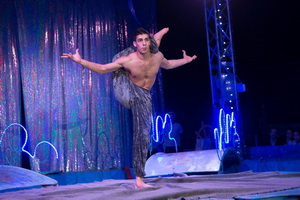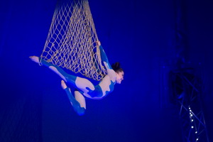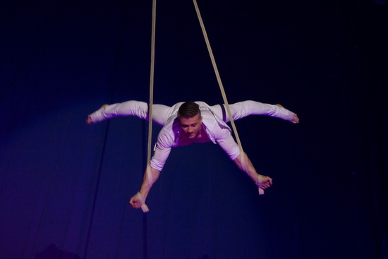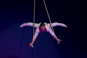 Eine außergewöhnliche Strapatendarbietung arbeitet ein junger Artist. Die verschiedenen kraftvoll ausgeführten Evolutionen werden jeweils mit einem Sprung hoch aus der Kuppel auf ein großes Kissen in der Manegenmitte abgeschlossen. Dieses ist mit einer Reihe elastischer Bänder überspannt, die dem Artisten zur Gestaltung der Übergänge zwischen den diversen Flügen dienen.