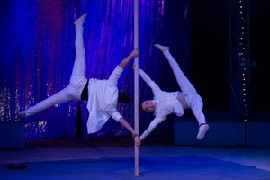 Das kasachische Duo Adlet und Kamyla arbeitet mehrere Darbietungen im Programm. Vor der Pause zeigen sie eine Reihe attraktiver Tricks am chinesischen Mast. Effektvoll werden die Abfaller aus großer Höhe mit dem abfangen dicht über der Erde verkauft.