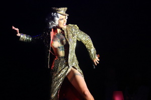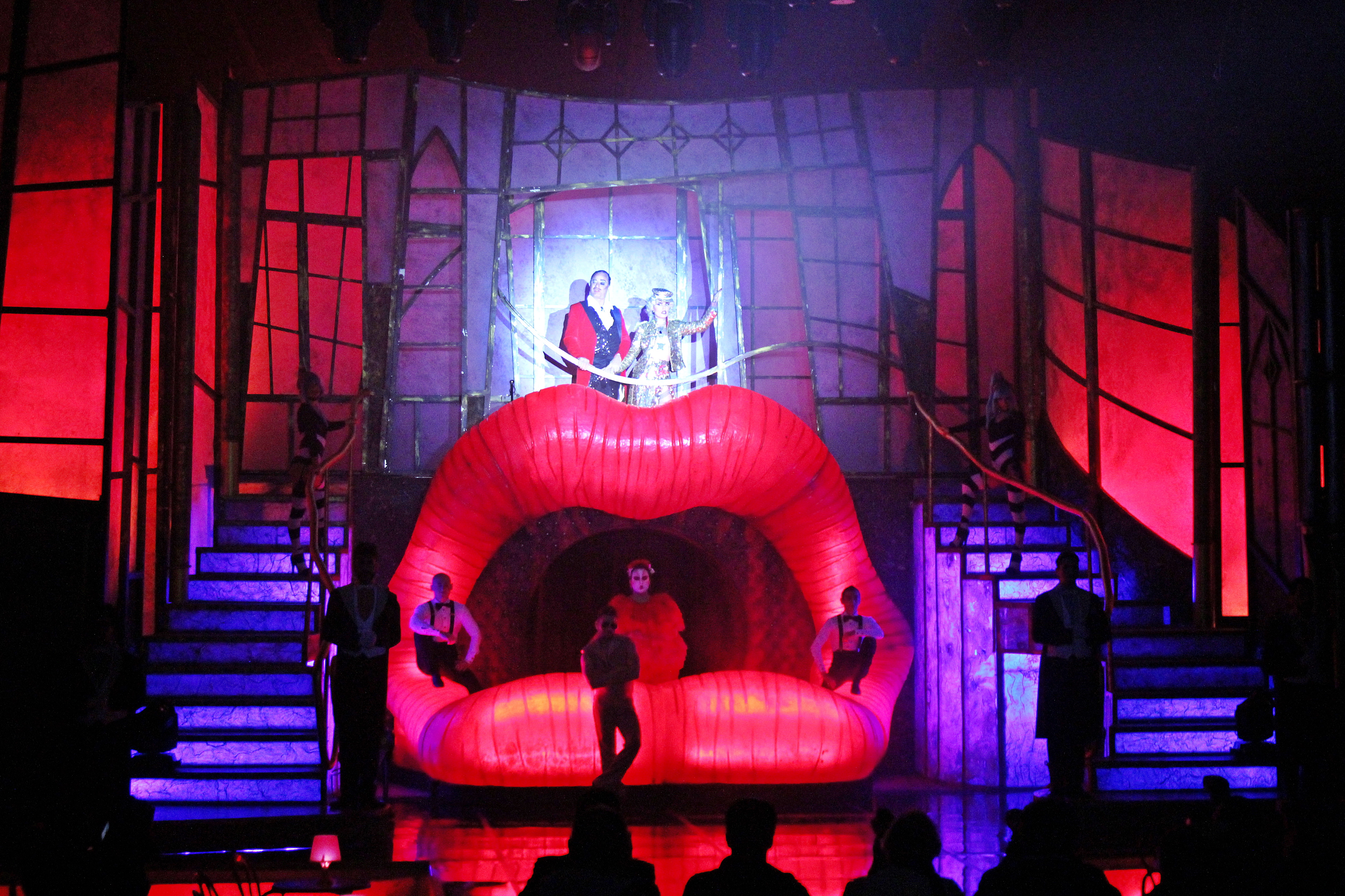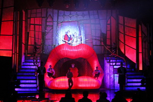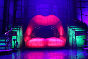 Die mit einem schlichten roten Vorhang verschlossene Bühne offenbart zu Showbeginn ein üppiges Bühnenbild, dessen zentrales Element der große rote Kussmund mit dem dahinterliegenden „Hole“ bildet.