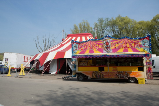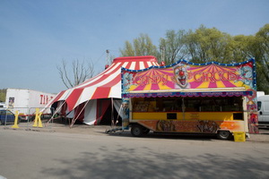 Auf einem Parkplatz am Rande der Ortschaft war Circus aufgebaut. Das schmucke, elegante Zwei-Masten Chapiteau nimmt den größten Teil des Geländes ein. Die Plane des rot-weiß gestreiften Zeltbaus mündet am Rondell in weit nach außen gezogenen schwungvollen Bögen und feine goldfarbene Applikationen zieren die Zelthaut.