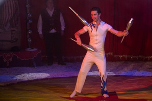 Samuel Pauwels präsentiert vor der Pause eine elegant in Szene gesetzte Jongleurnummer. Mit fünf Ringen werden die ersten Routinen gekonnt ausgeführt. Sicher und flott wird alsbald mit sieben und schließlich mit neun Ringen jongliert. Variantenreich manipuliert der sympathische junge Mann mit weißen Keulen. Souverän erfolgen die Muster mit drei, vier und fünf Requisiten.