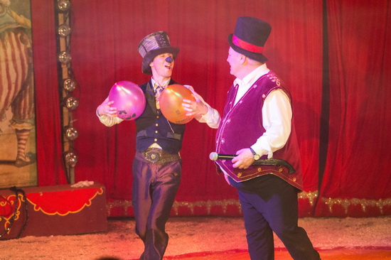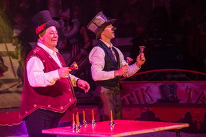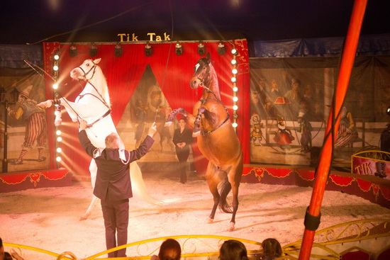 Exzellente Clownerie nimmt in der Show breiten Raum ein. Samuel und Marquis Pauwels sowie Sandor Donnert sind die Akteure. Donnert, als strenger Stallmeister, weist Clown Tik Tak an die Piste zu reinigen und hält den Clown mit immer wieder frisch verstreutem Sägemehl auf Trab.